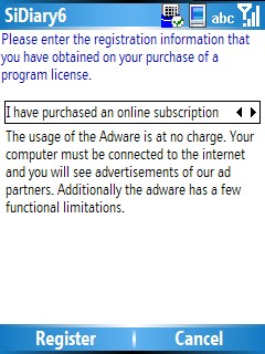 If you have purchased the subscription version of SiDiary you can register all program versions (PC, Pocket PC, Windows Smartphone, Android and Java-based cell phone) to use SiDiary for 12 months without adware restrictions and commercial popups.