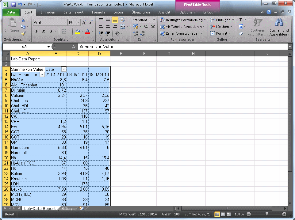 The lab data will be exported into an Excel Pivot table. You need SiDIary V6 for use with this template! |