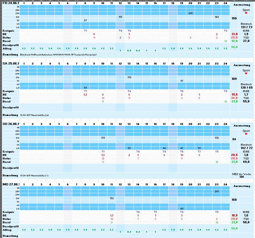 Vorlage zur Abbildung des in Althausen eingesetzten Insulinpumpenprotokolls nach Dr. Teupe. Die SiDiary-Vorlage entstand auf der Excel-Vorlage von Michael Neunhoeffer in Gemeinschaftsarbeit einiger SiDiary-Forums-Mitglieder unter Federführung von Ralf Schönberger. Die Vorlage ist nicht für Patienten ohne entsprechend geschultes Know-How geeignet! Die Darstellung/Protokollierung setzt Wissen voraus, das dort im Rahmen der Pumpenschulungen vermittelt wird! Jetzt auch mit den Anpassungsfaktoren und geeignet für mmol/l User. |